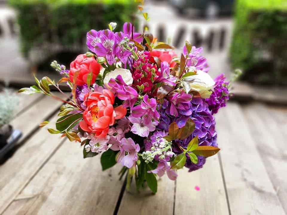 Класически кръгъл букет изработен с разнообразни по форма, текстура и дължина цветя в лилаво-цикламена гама.При поръчка букетът се изпълнява със същата големина и форма с наличните в магазина цветя.На примерната снимка букетът е с размер "голям".