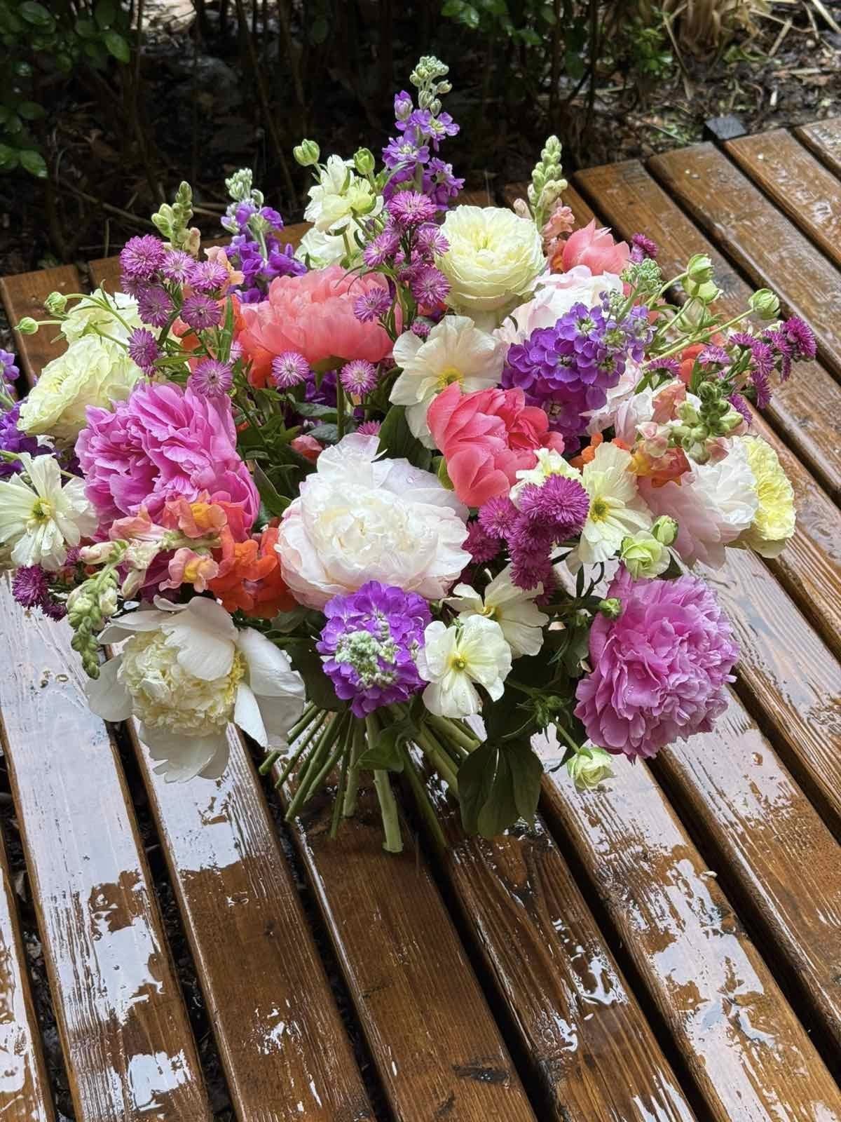 Елегантен пъстър букет изработен с разнообразни по форма, текстура и дължина цветя.